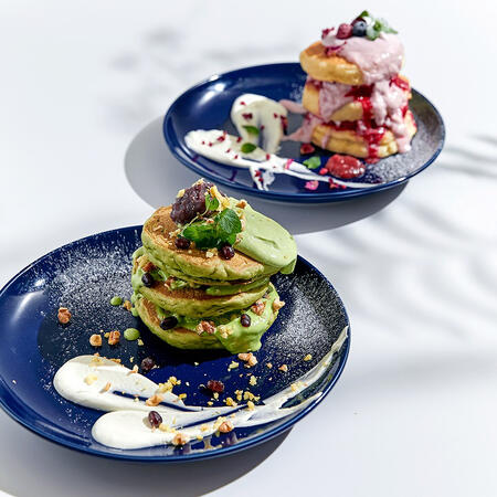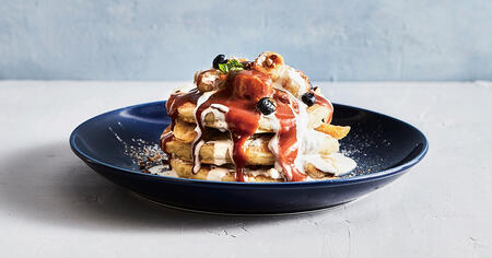 Thick dough kneaded with soft cheese and fried into a hearty donut, slathered with yet more creamy cheese and a sweet-and-tart berry sauce.