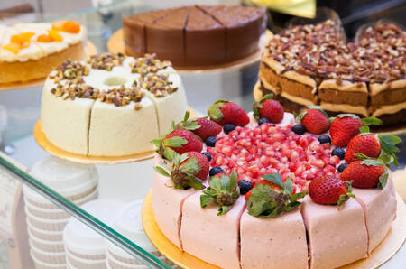 A multi-tiered set with several varieties of luscious sweetcakes and tarts.
